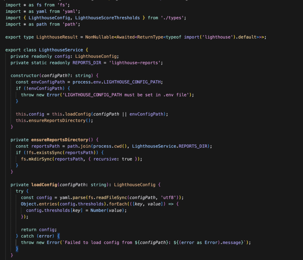 Metoda loadConfig() wczytuje konfigurację Lighthouse z pliku YAML, parsuje go na interfejs LighthouseConfig i zwraca obiekt zawierający wszystkie wcześniej zdefiniowane pola. Jest to kluczowy element, ponieważ na podstawie tego obiektu określane są wszystkie parametry testów.